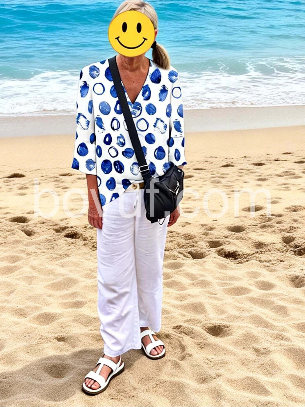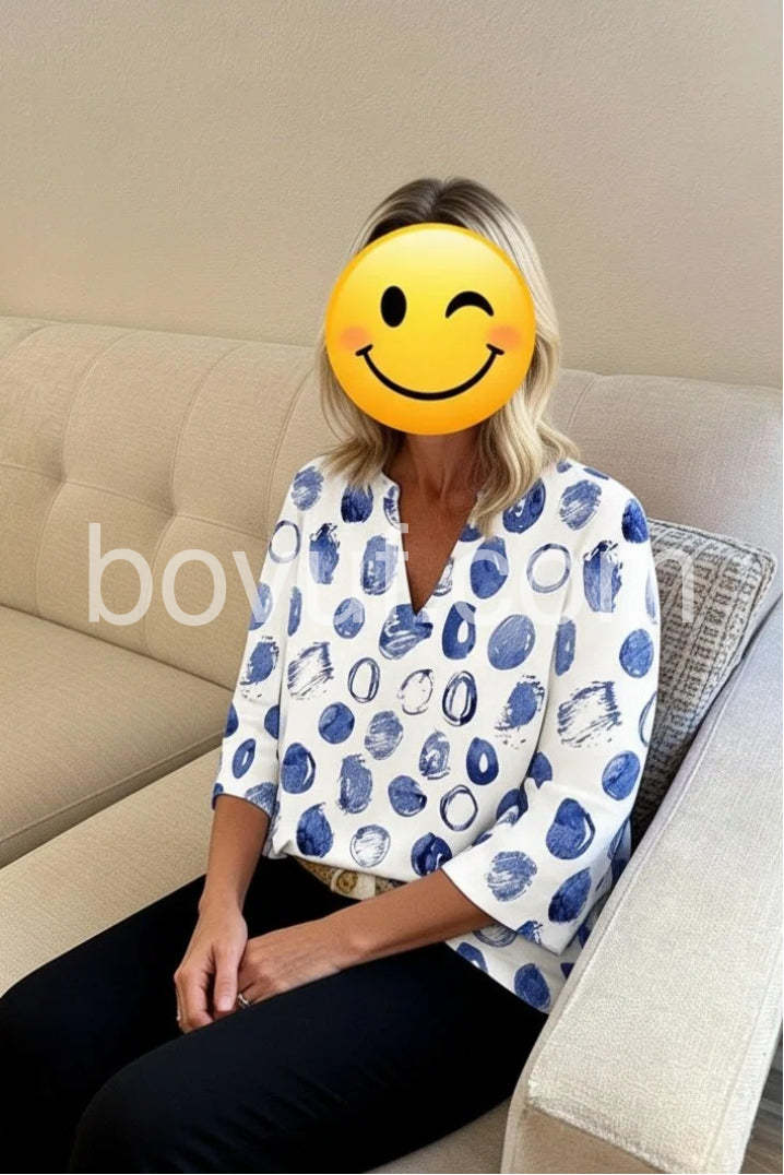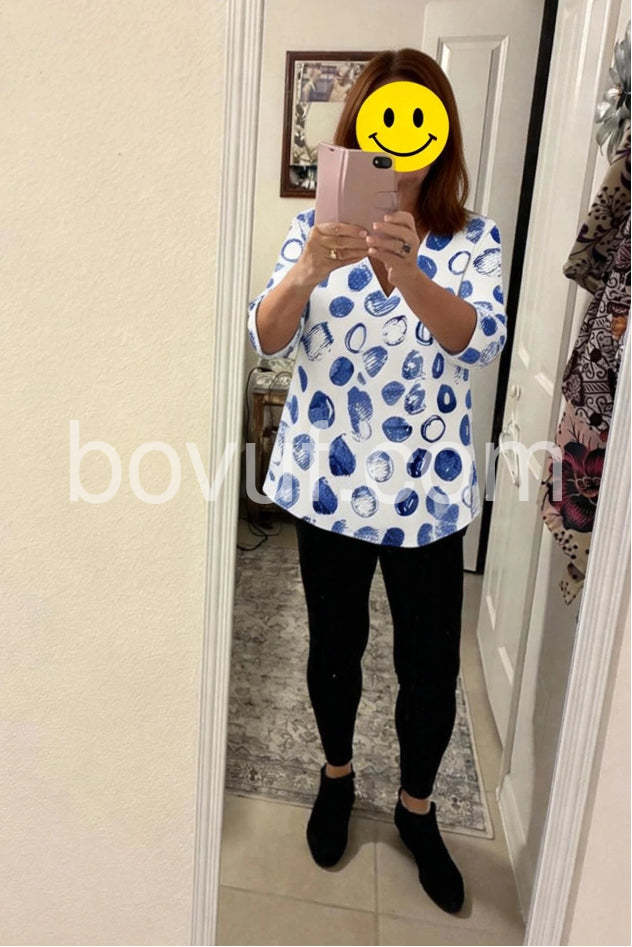 This blue abstract dot-ring print tunic top provides the ultimate complement to your workwear, casual looks, or night looks. Wear this versatile ¾ sleeve top with jeans, white pants, a black pantsuit, and so much more. Machine wash normal with light colors or hand wash. May be hung up to dry or lay flat. Light ironing if needed.
