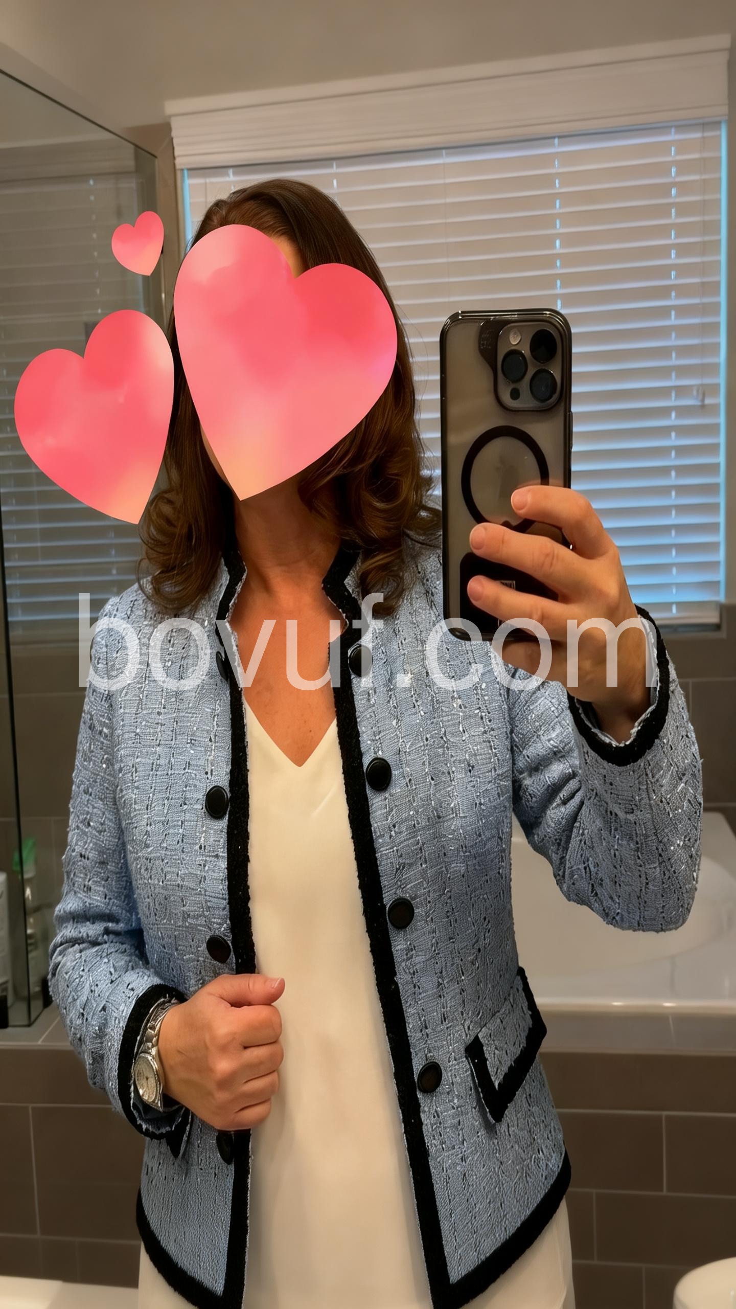 This blue tweed blazer features a refined black trim and a classic double-button closure, offering a sharp, tailored fit. Its textured fabric adds depth and sophistication, making it ideal for both professional settings and stylish casual wear. Designed to elevate your wardrobe with timeless elegance and structured silhouette.