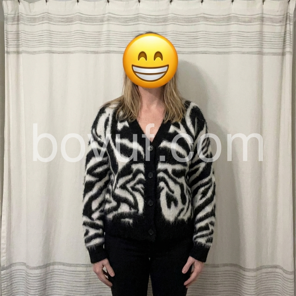 Elevate your wardrobe with this bold zebra-print knit cardigan crafted from a luxurious soft mohair blend. Its distinctive pattern adds a striking visual contrast, while the mohair fibers ensure lightweight warmth and a plush texture. Designed for both style and comfort, this cardigan is ideal for layering during transitional seasons, providing a sophisticated yet edgy statement piece to your collection.