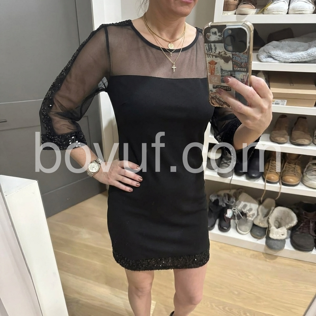 Elevate your evening look with this striking black mini dress, where sheer sleeves create an alluring contrast against the fitted silhouette. The sequined hem catches light with every movement, delivering sophisticated sparkle without overwhelming the design. Perfect for cocktail events or upscale nights out, this piece balances elegance with contemporary edge. The sheer sleeve detailing adds dimension while maintaining a refined aesthetic, making it versatile enough to transition from dinner to dancing.