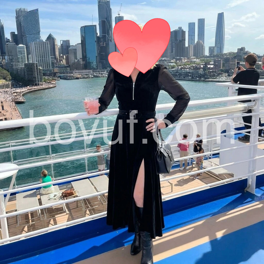 Black Velvet Zip Front Long Sleeve Maxi Dress